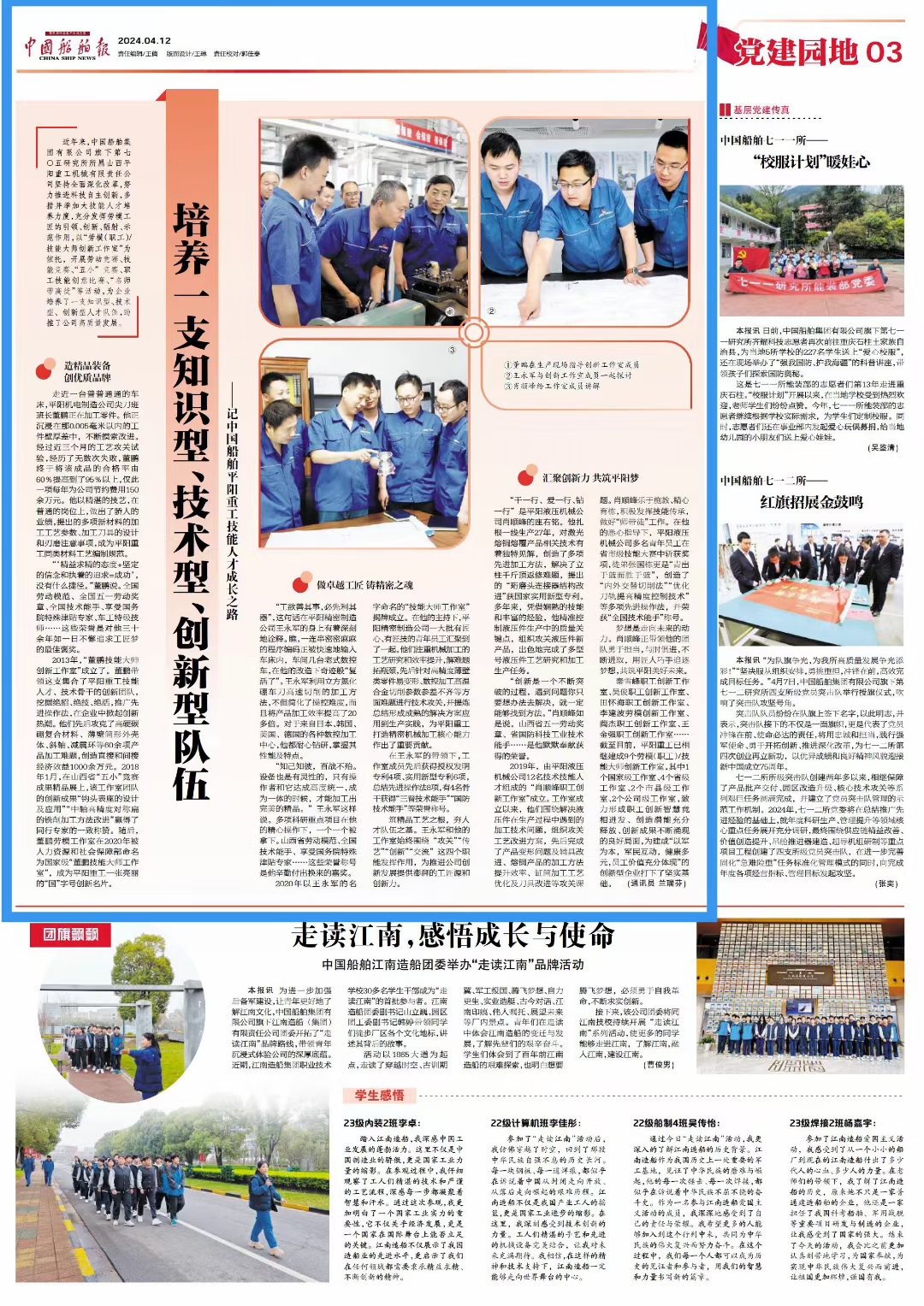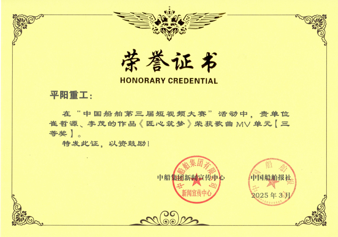 《平陽通訊》榮獲船舶新聞“優(yōu)秀企業(yè)報(bào)刊”稱號(hào);《培養(yǎng)一支知識(shí)型、技術(shù)型、創(chuàng)新型隊(duì)伍——記中國船舶平陽重工技能人才成長(zhǎng)之路》榮獲文字類二等獎(jiǎng)、《用“智慧大腦”系統(tǒng)開采礦山》《當(dāng)平陽青年遇上傳統(tǒng)文化,匠心撞個(gè)滿懷》榮獲文字類三等獎(jiǎng);《匠心筑夢(mèng)》榮獲第三屆短視頻大賽三等獎(jiǎng)。